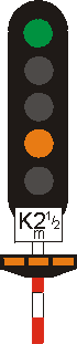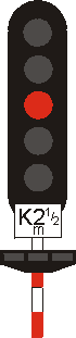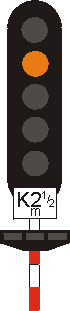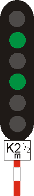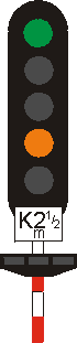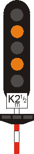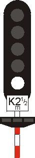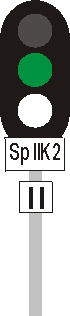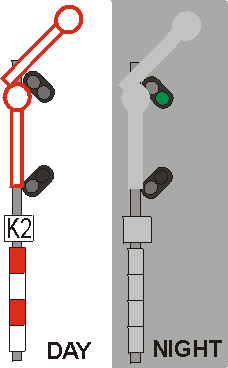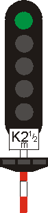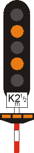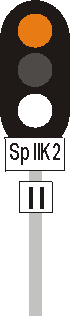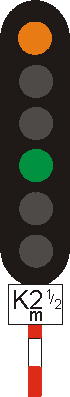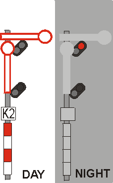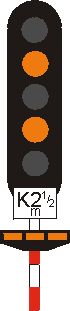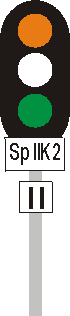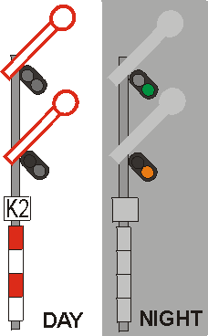 Signals in the row “the same as previously” are repeating signals (or repeater signals), applied when the main signal is not visible easily (e.g. on curves). For a repeater, “the next signalling device” is another repeater (up to 3 repeaters may exist) or the semaphore whose signal is repeated. Signals in the row “only warning” are shown on warning shields, not semaphores. The two types of the devices can be easily distinguished, note the colour of the post (mast, pillar) of the device, and see below. There also exist, or existed in the past, other colour-light signals, being part of the old signalling system: |