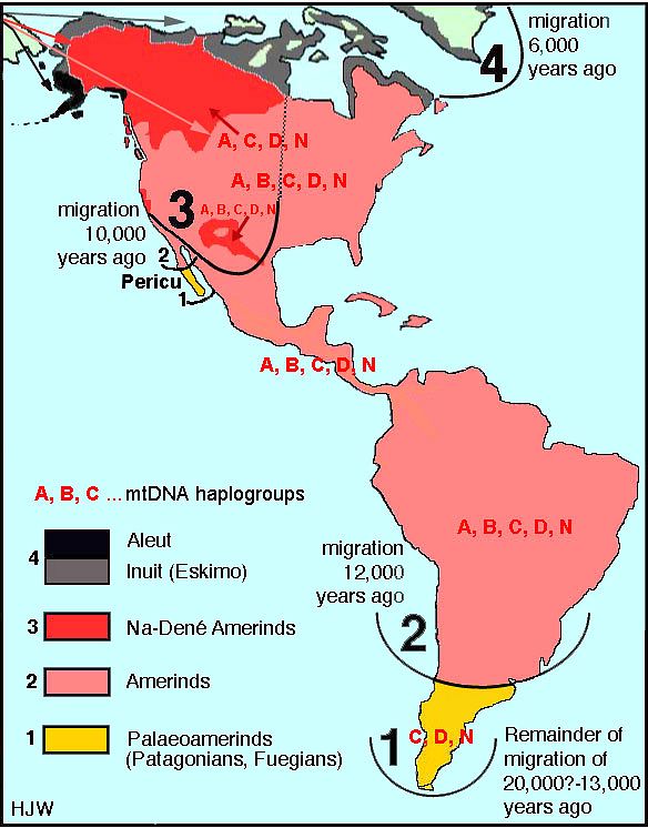 (e) Piąta fala to ludy penuti-majańskie oraz Chibcha i Tucano, zasiedlające głównie Amerykę Środkową. Wysunięto hipotezę o związkach języków penuti z uralskimi, zob. tutaj. Bardzo ciekawą tezę przedstawił John Asher Dunn. Według niego języki tsimshian (zwykle zaliczane do makrorodziny penuti) są grupą języków indoeuropejskich, a ich użytkownicy – potomkami migracji, która doprowadziła także do ukształtowania się Tocharów. Zaprezentowany przez niego materiał rzeczywiście skłania do refleksji, jednak zaliczenie grupy tsimshian do rodziny indoeuropejskiej jest chyba błędem. Natomiast widać w tej grupie wiele wyrazów, które mogą być starymi zapożyczeniami z indoeuropejskiego języka bliskiego tocharskiemu. Dowodzi to w każdym razie stosunkowo niedawnej migracji Indoeuropejczyków do Nowego Świata.