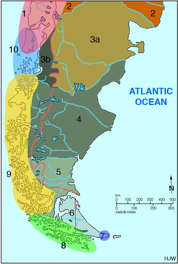 1. Mapucze (z grupy araukańskiej, z nowszej fali migracyjnej), 2. Puelcze, 3a. Künün-a-Güna, 3b.Küwach-a-Güna, 4. Mecharnuekenk, 5. Aonikenk, 6. Ona, 7. Haush, 8. Jaganowie, 9. Alakalufowie, 10. Chono.