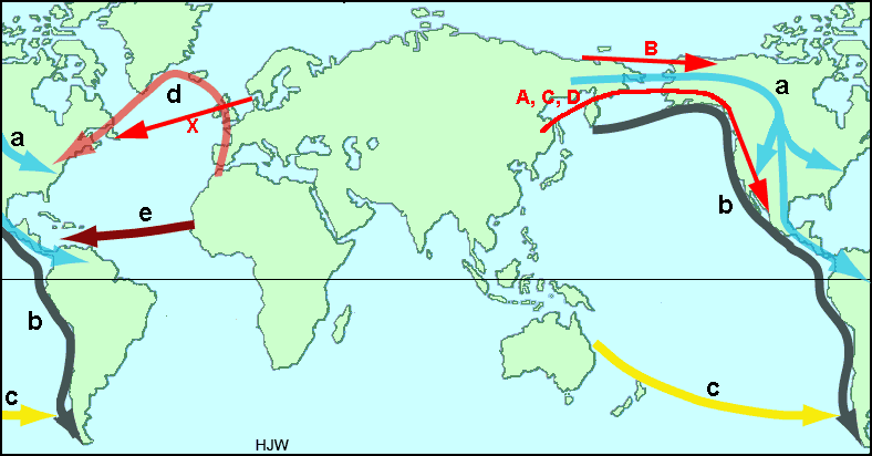 (e) Równikowa trasa przez Atlantyk z Afryki mogła również odgrywać pewną rolę, choć niewiele pisze się na jej temat w literaturze. Podróży na zachód sprzyjały wiatry i prądy, podobnie jak w czasach Kolumba. Jednak trasa ta pozostaje najbardziej teoretyczna ze wszystkich, i właściwie brak dowodów, że ktokolwiek kolonizował Amerykę w ten sposób. Istniają natomiast przesłanki, że podróży transatlantyckich dokonywano w czasach znacznie bliższych współczesności, o czym niżej.