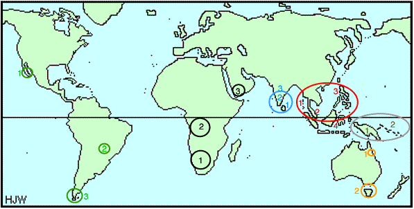 Negrytoidzi nowogwinejscy (kolor szary): pewne plemiona 1. Papuy Nowej Gwinei, 2. Wysp Salomona (i być może innych wysp Oceanii).
