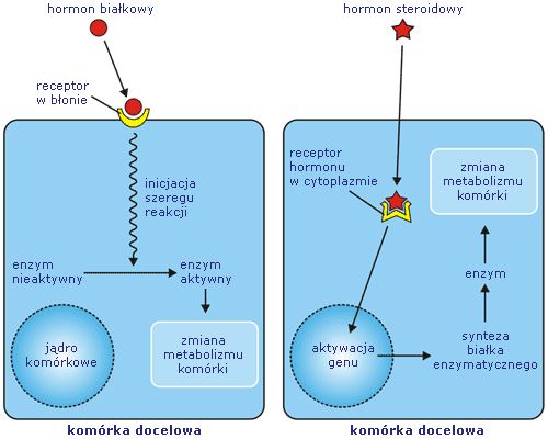Hormony steroidowe łatwo przechodzą przez zbudowaną z substancji lipidowych (tłuszczowców) błonę komórkową, więc mogą połączyć się z receptorami zlokalizowanymi w cytoplazmie. Białkowe hormony mają cząsteczki o dużych rozmiarach. Nie przechodzą więc przez błonę komórek – dlatego receptory dla tych informatorów wbudowane są w błonę komórkową.