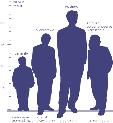 Gigantyzm i karłowatość. Nadmiar hormonu wzrostu pojawiający się przed zakończeniem okresu wzrostu organizmu prowadzi do gigantyzmu, niedobór zaś – do karłowatości. Natomiast nadmiar tego hormonu po okresie wzrostu skutkuje akromegalią. Z którą sytuacją zatem wiąże się nadmierny wzrost ciała?